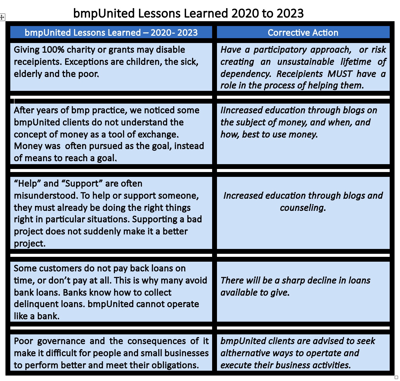 bmpUnited has learned many lessons since it was established in the middle of COVID-19 in 2020. We are now taking corrective actions and modifying our nonprofit business practices and choices to guarantee we stay in business. Existing projects will continue to be managed carefully to ensure a better and softer landing at each project completion.